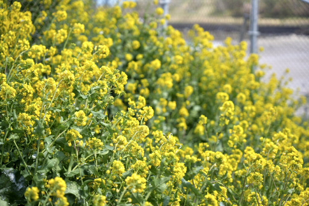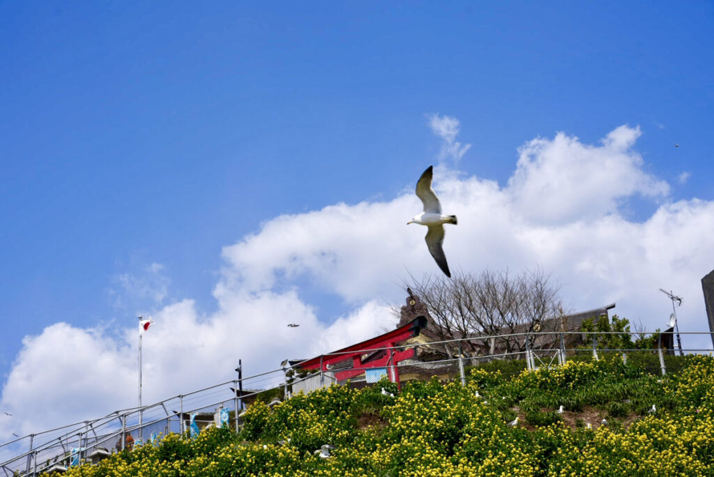 5月には、島に菜の花が咲き乱れ、菜の花の黄色と鳥居の赤、白いウミネコと青空のコントラストが美しい光景が広がります。